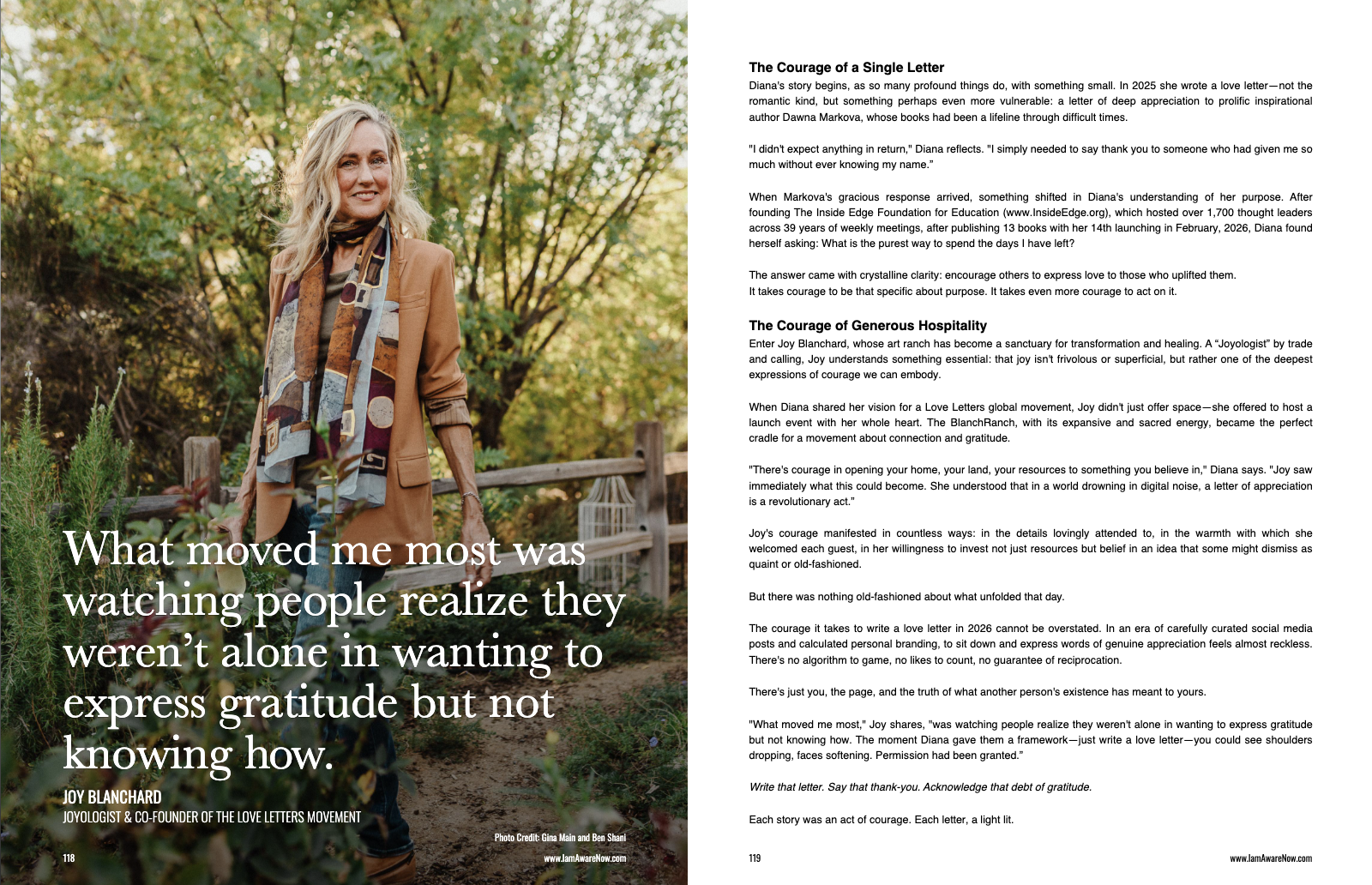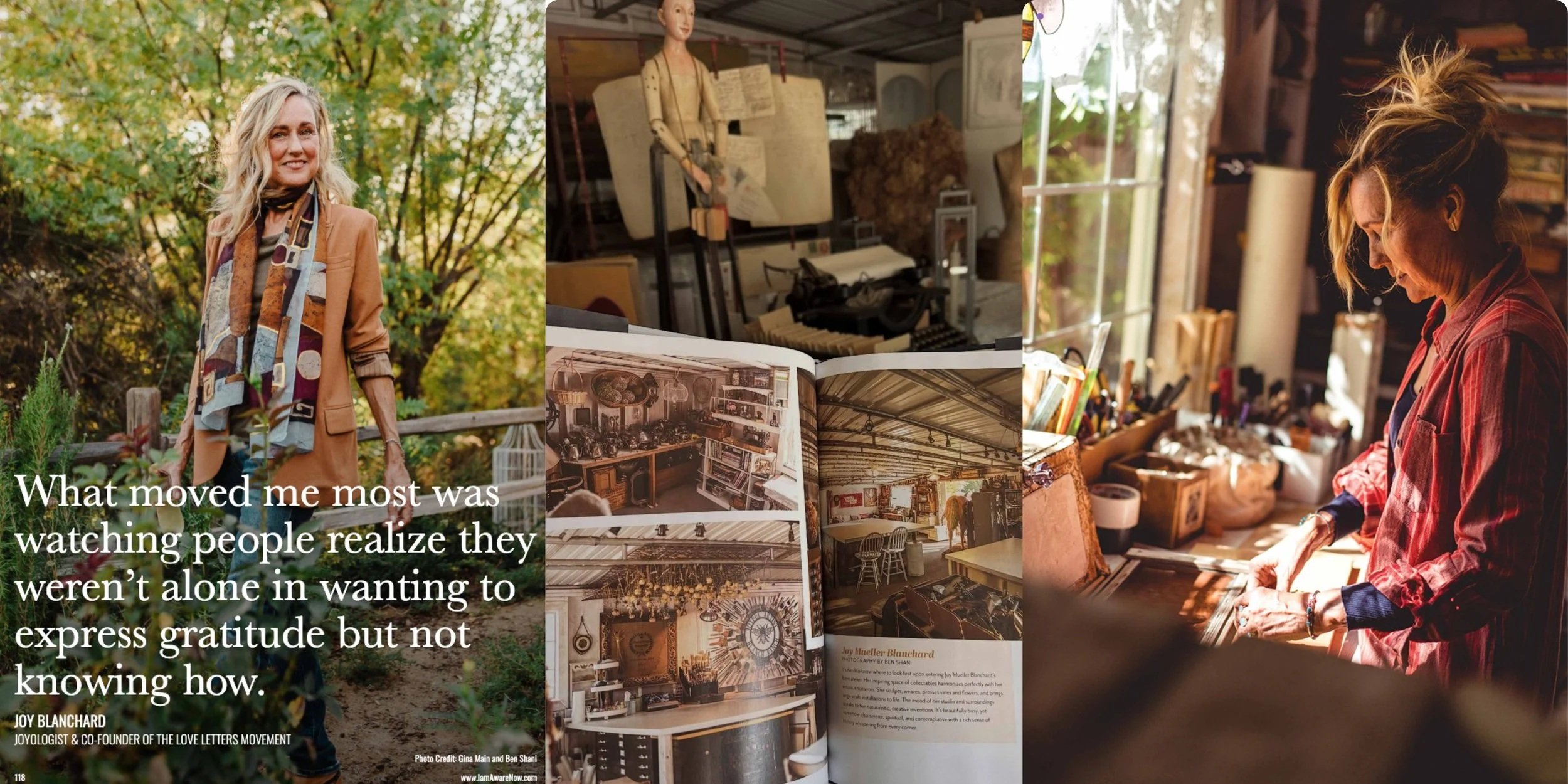 Joy Blanchard’s latest project, Love Letters, a global movement alongside founder and New York Times bestselling author Diana Wentworth. Hosted at Joy’s BlanchRanch, the project invites people to reconnect through the simple yet courageous act of writing letters of gratitude and appreciation. Rooted in Joy’s belief that creativity, ritual, and community are inseparable, this work reflects her ongoing commitment to creating spaces where meaningful human connection can flourish.